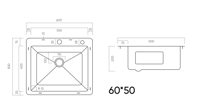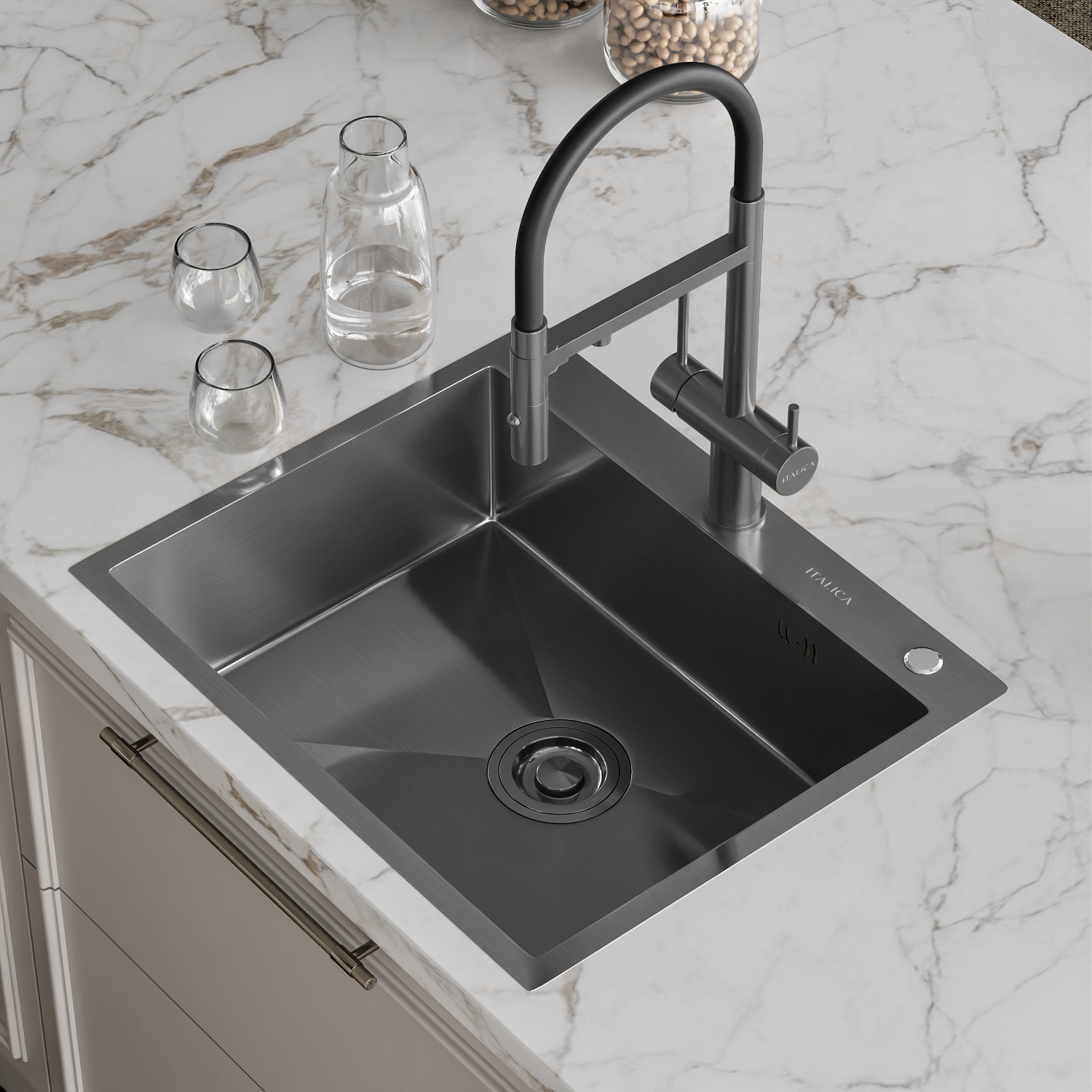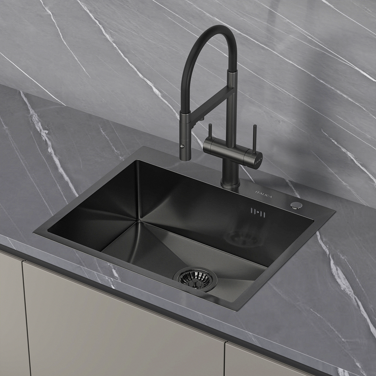 —Мойка врезная Italica 60*50 см Графит 304 сталь (с сифоном, дозатором)