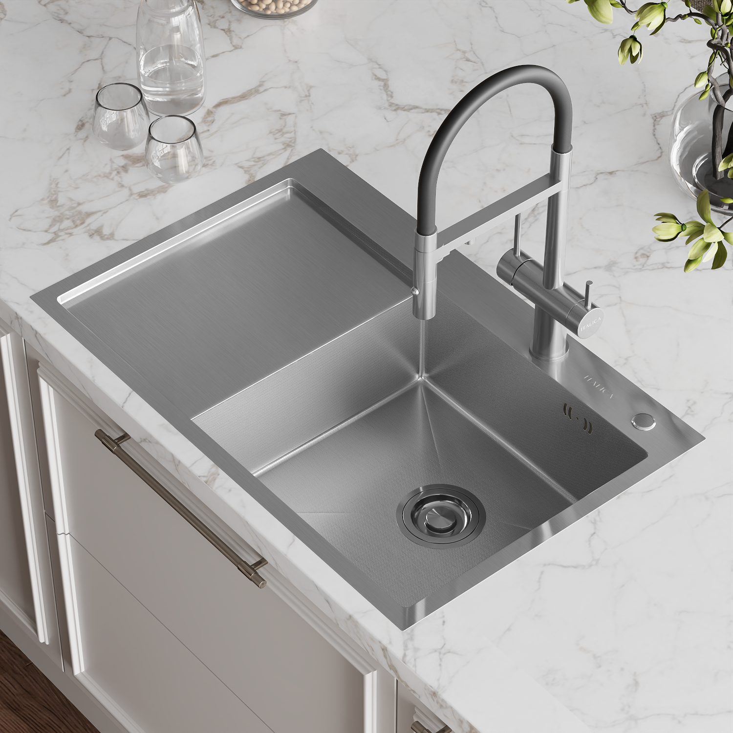 —Мойка врезная Italica 78*51 см с крылом Сатин правая Ультра покрытие 304 сталь (сифон, дозатор)