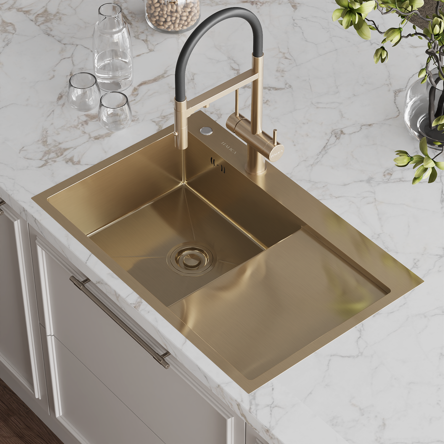 —Мойка врезная Italica 78*51 см с крылом Золото левая 304 сталь (с сифоном, дозатором)