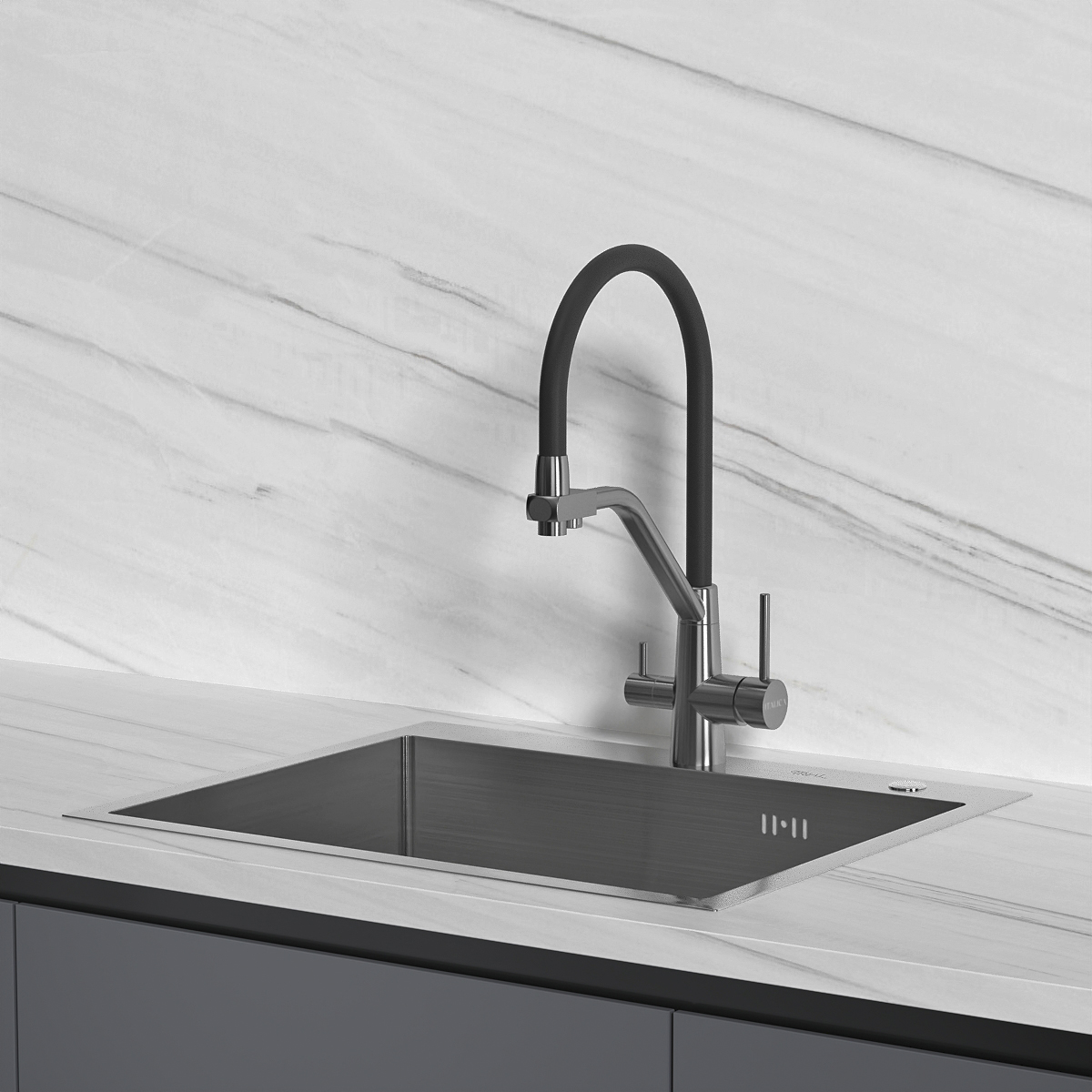 Смеситель с гибким шлангом и фильтром Сатин+Черный ITALICA