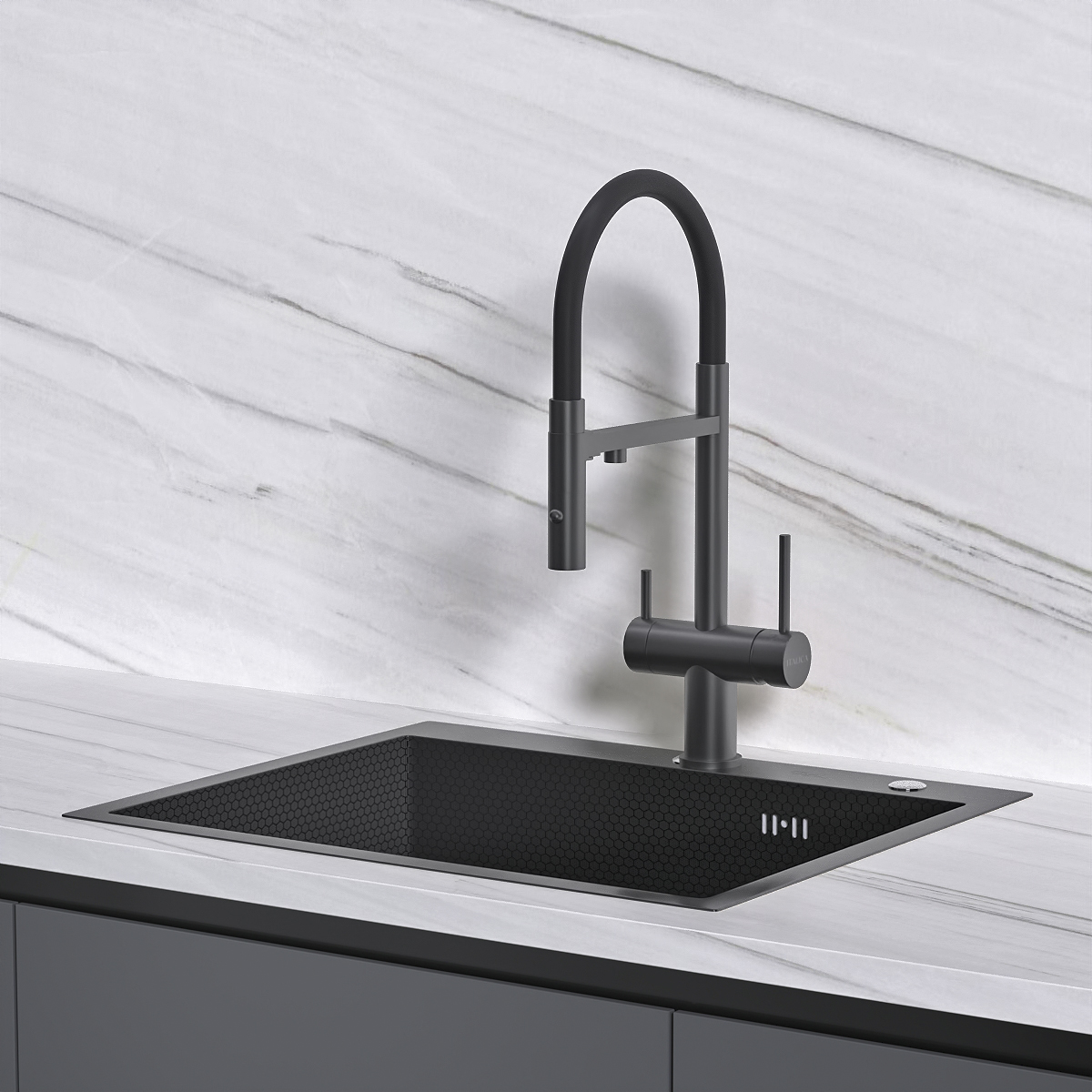 Смеситель с гибким шлангом на магните и фильтром Оружейная сталь+Черный ITALICA